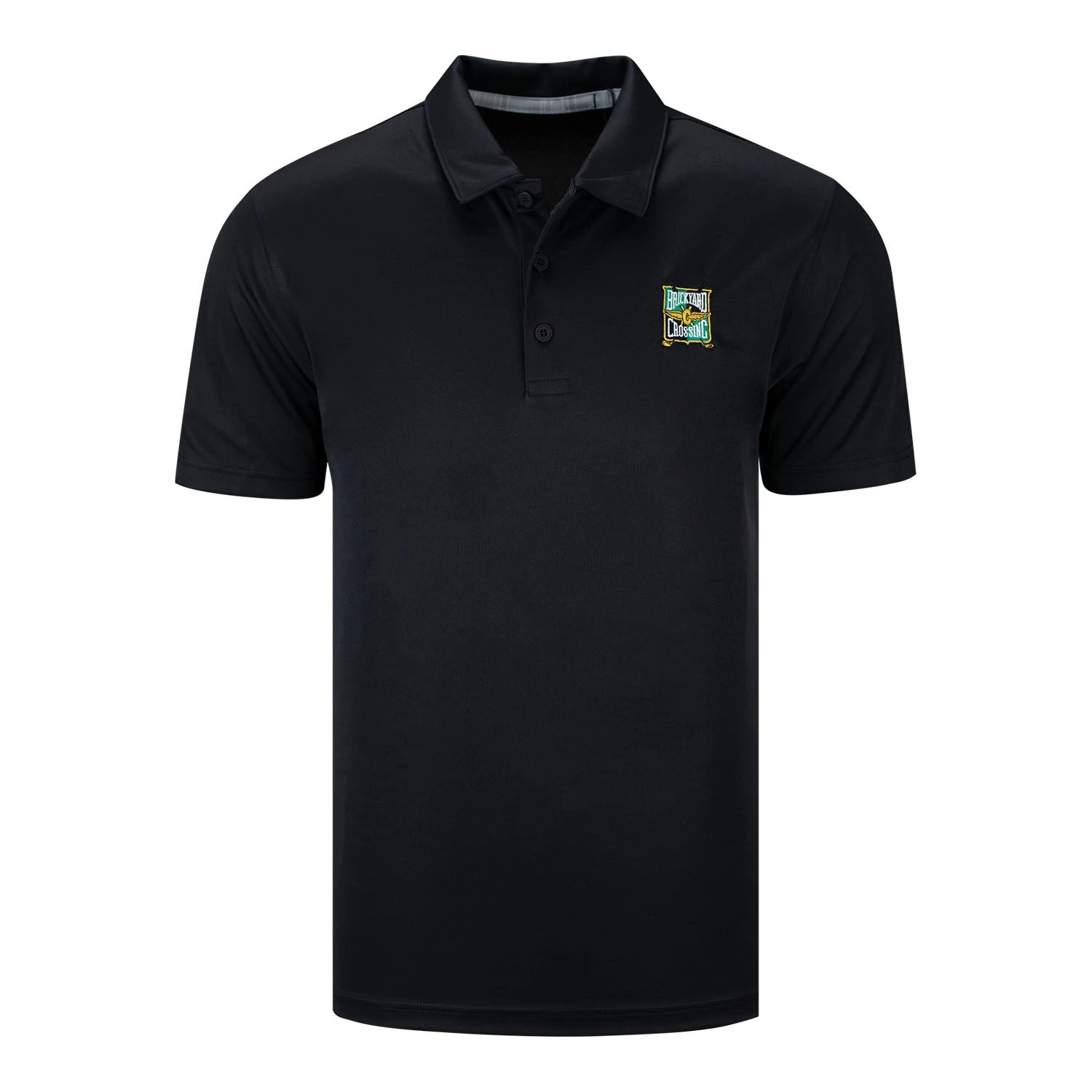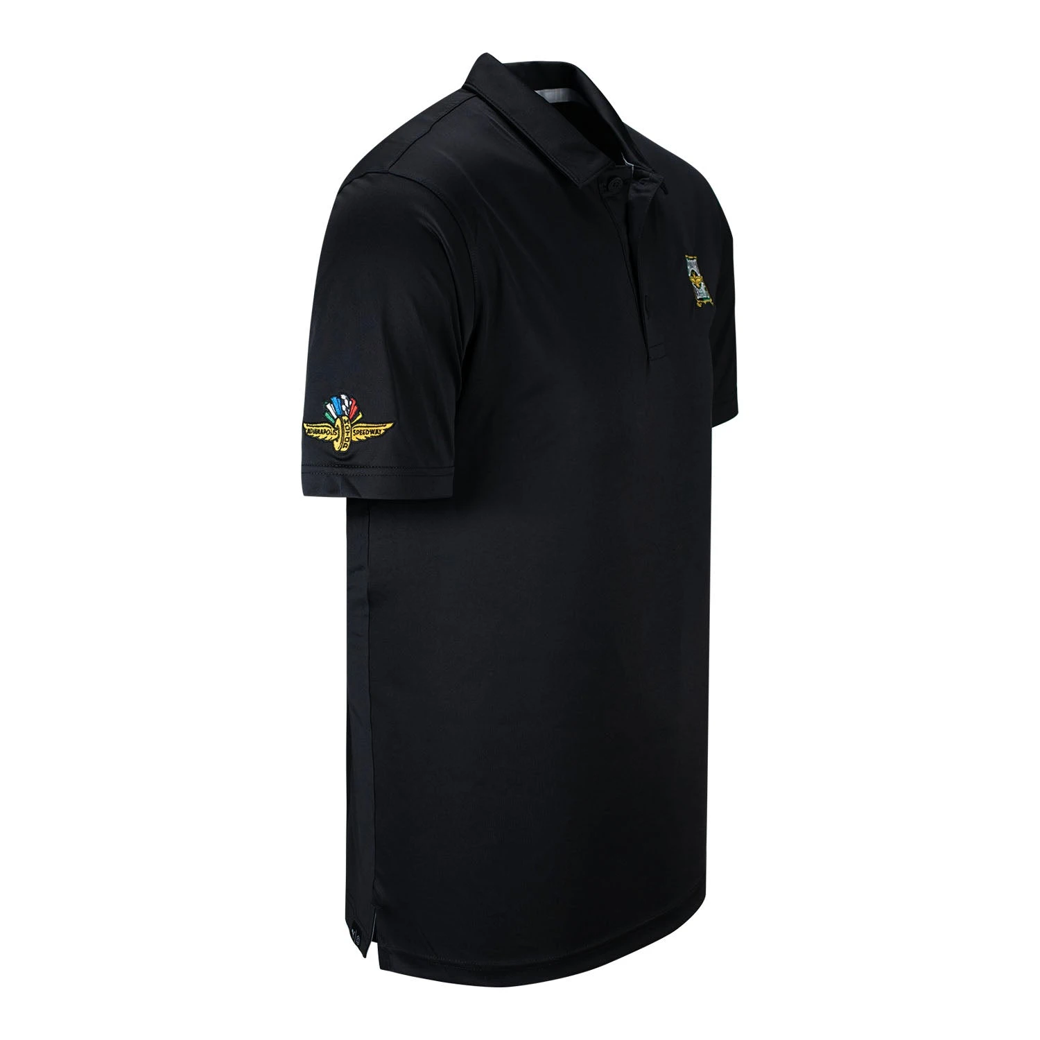 Solid black puma polo with BYC logo on chest and IMS logo on sleeve
