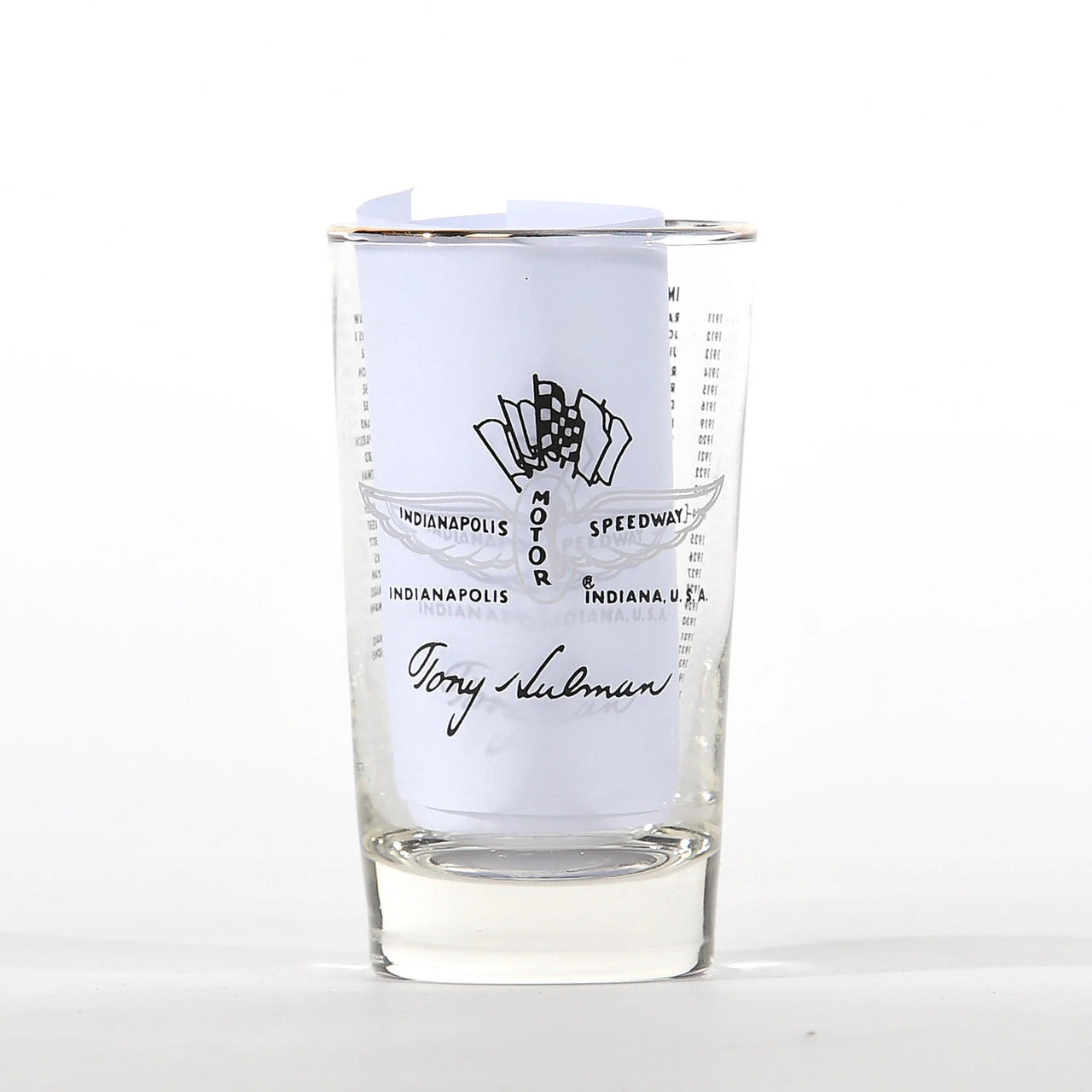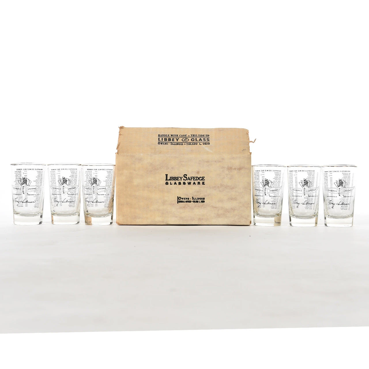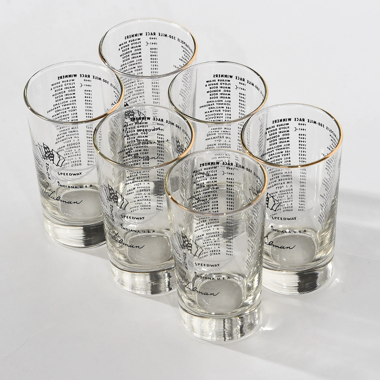 In 1950, Tony Hulman commissioned a set of glassware that would feature all of the Indianapolis 500 winners to date. He and his family continued this annual tradition for over 60 years. 1969 Mario Andretti Set includes a set of 6 Hi Ball glasses Rimmed in 24k gold, made in the USA, and includes the original box. Only 100 Sets Available.