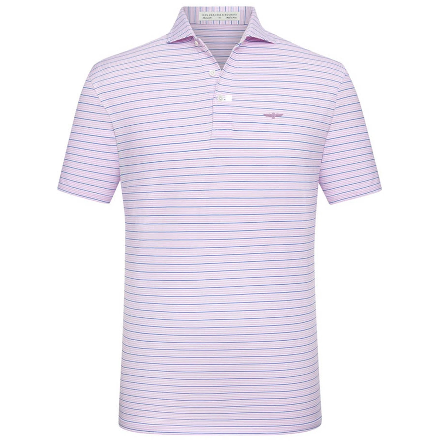 This sophisticated Holderness & Bourne jersey knit perofrmance polo has stripes with great balance, a structured spread collar, genuine trocas shell buttons, and a signature tailored fit! Make sure and buy one today!
