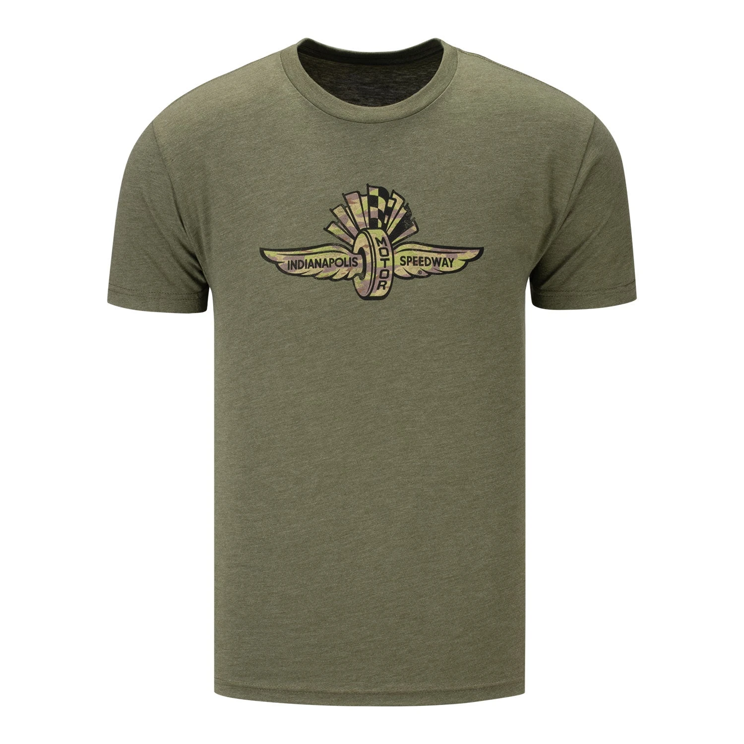 Show up in this new basic design featuring the Indianapolis Motor Speedway Wing Wheel Flag logo in camo printed across a military green short sleeve tri-blend t-shirt. This comfortable, casual and loose fitting dark green t-shirt will quickly become one of your favorites.