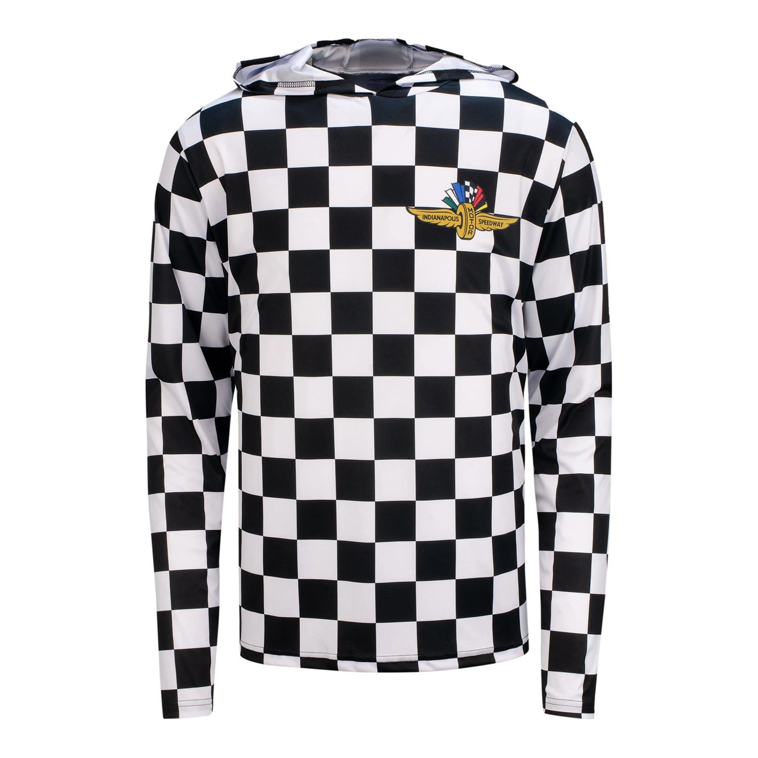 Get ready for the finish line with this Indianapolis Motor Speedway all over print checkered flag performance hoodie!