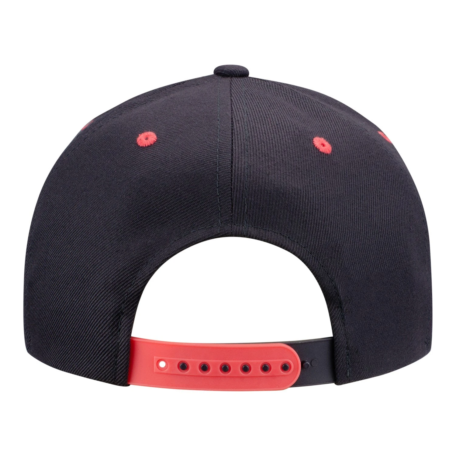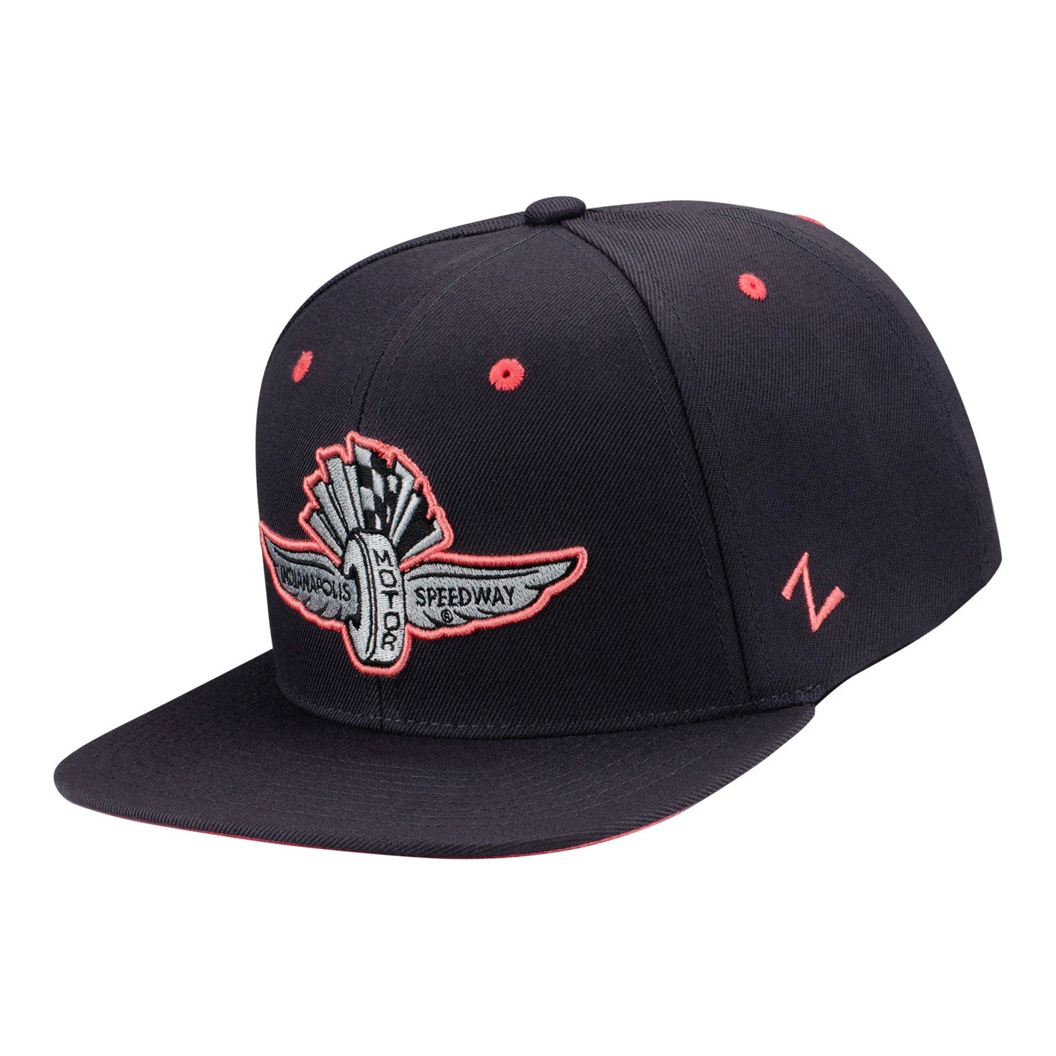 Step outside the box with this Flat Bill hat that has a pop of pink around the Wing Wheel Flag Logo.